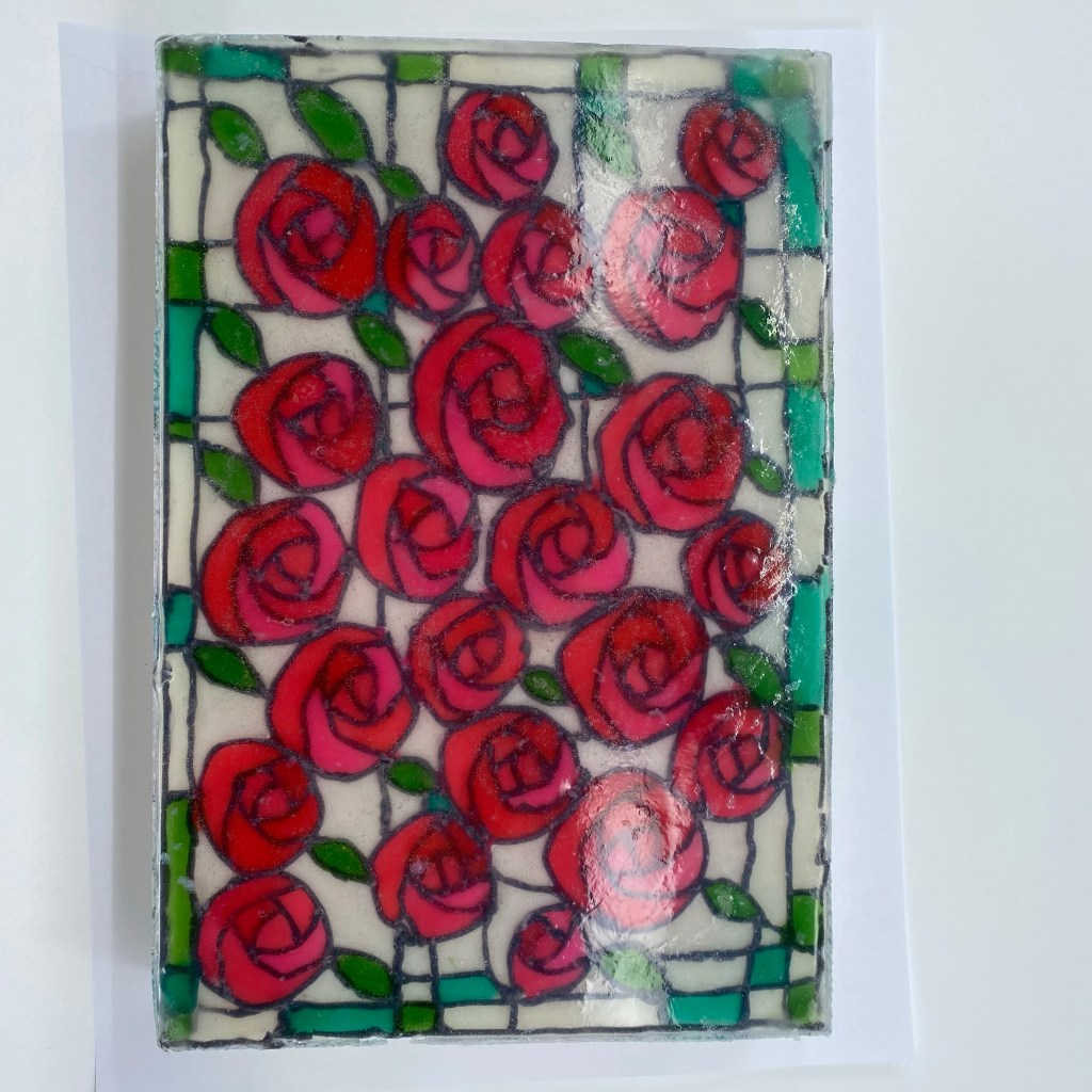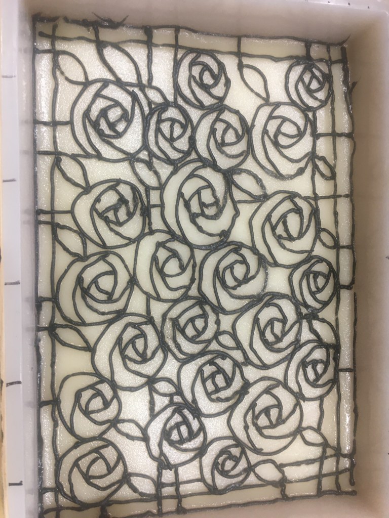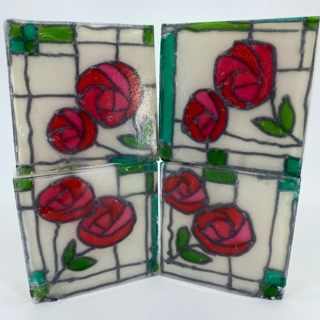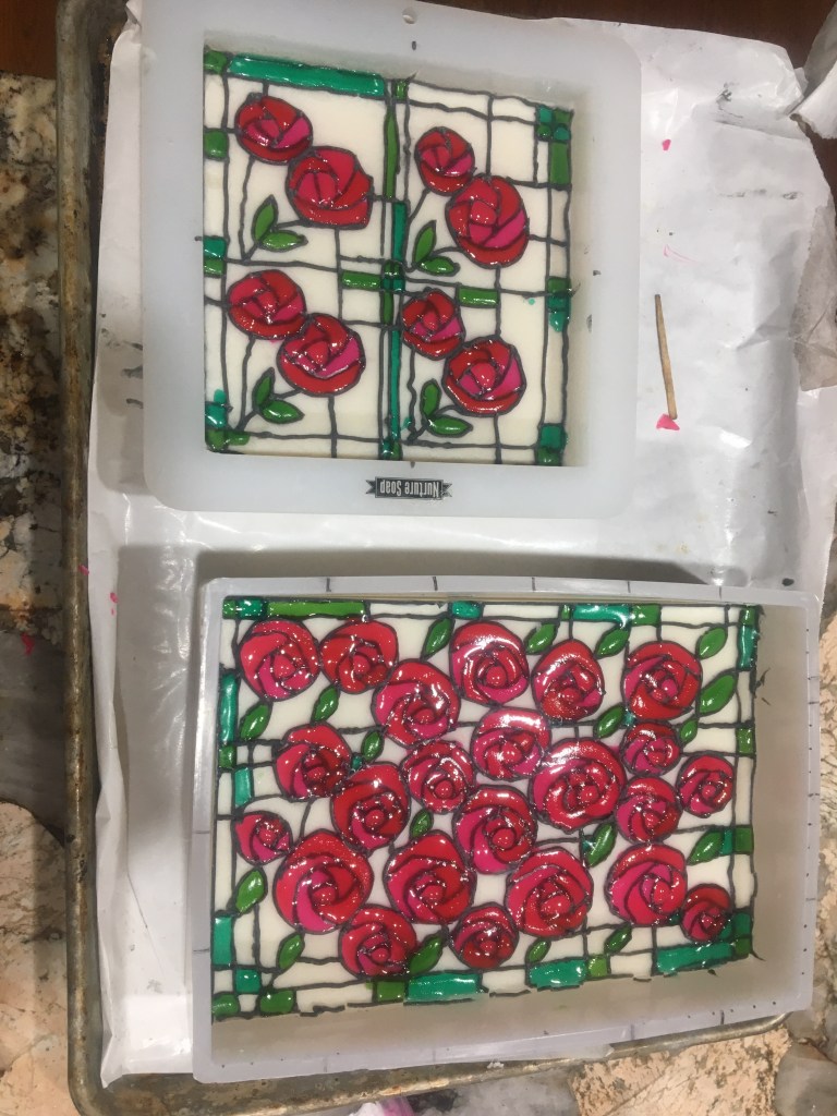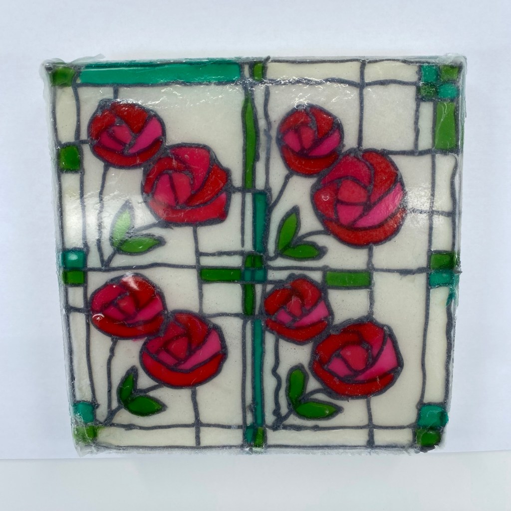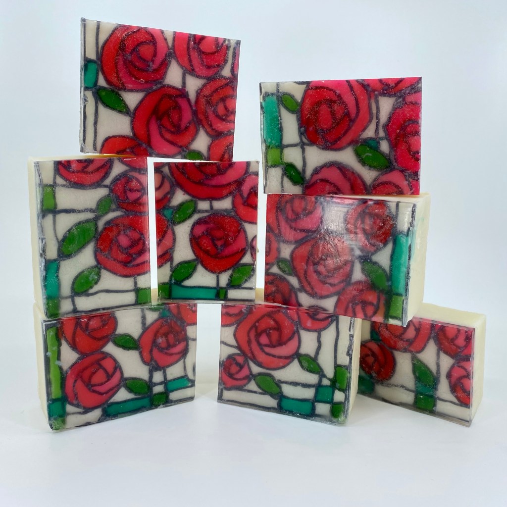 Charles Rennie Mackintosh was a Scottish artist famous for his unique art deco architecture, stained glass, furniture, paintings, household items, and more. He designed the architecture of a Glasgow Art School building that was sadly destroyed in a fire. The rebuilding and restoration of the building is in progress. When I read that this month’s challenge would be to create stained glass window soap, the only choice for me was to make a Charles Rennie Mackintosh inspired soap.